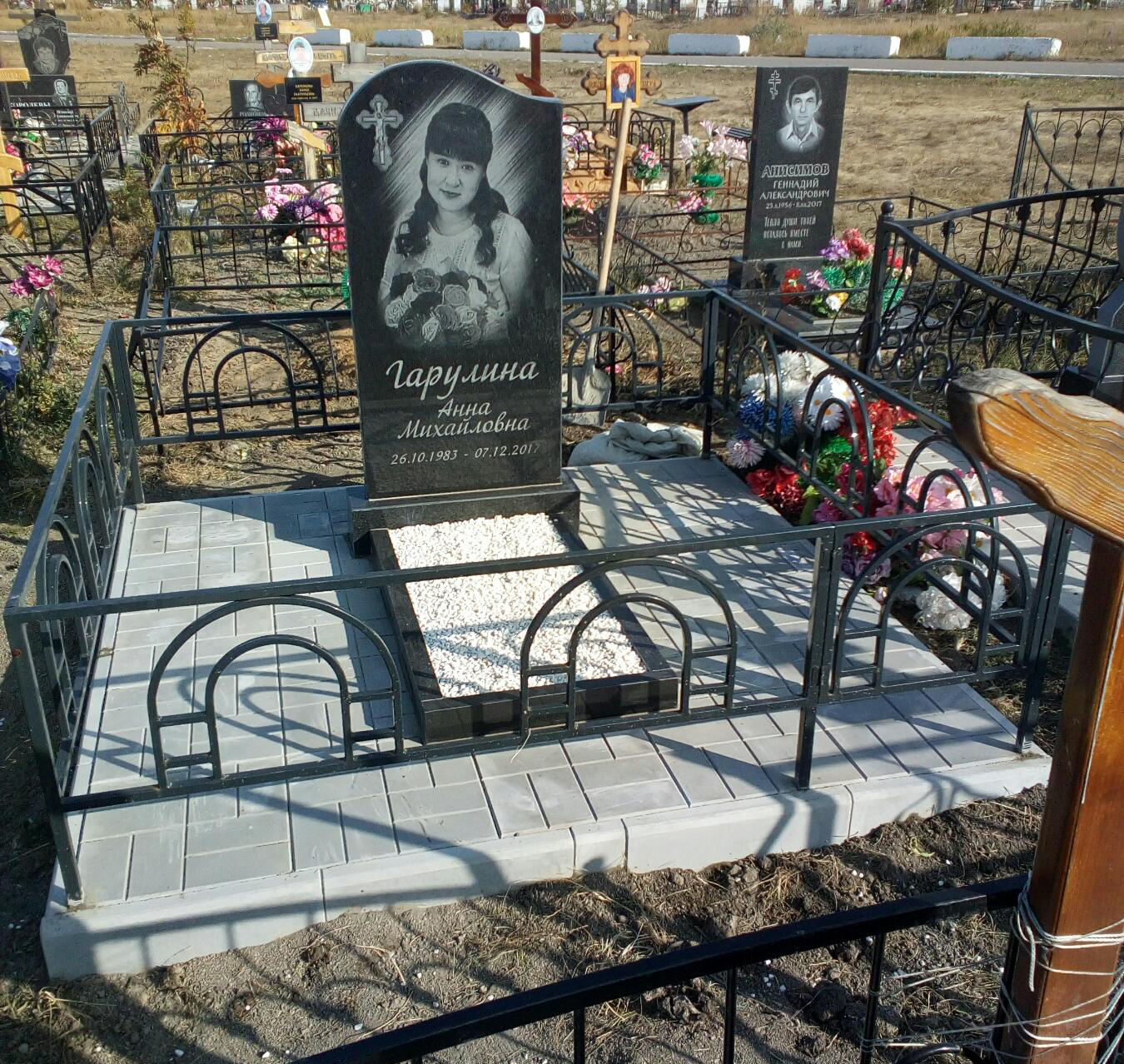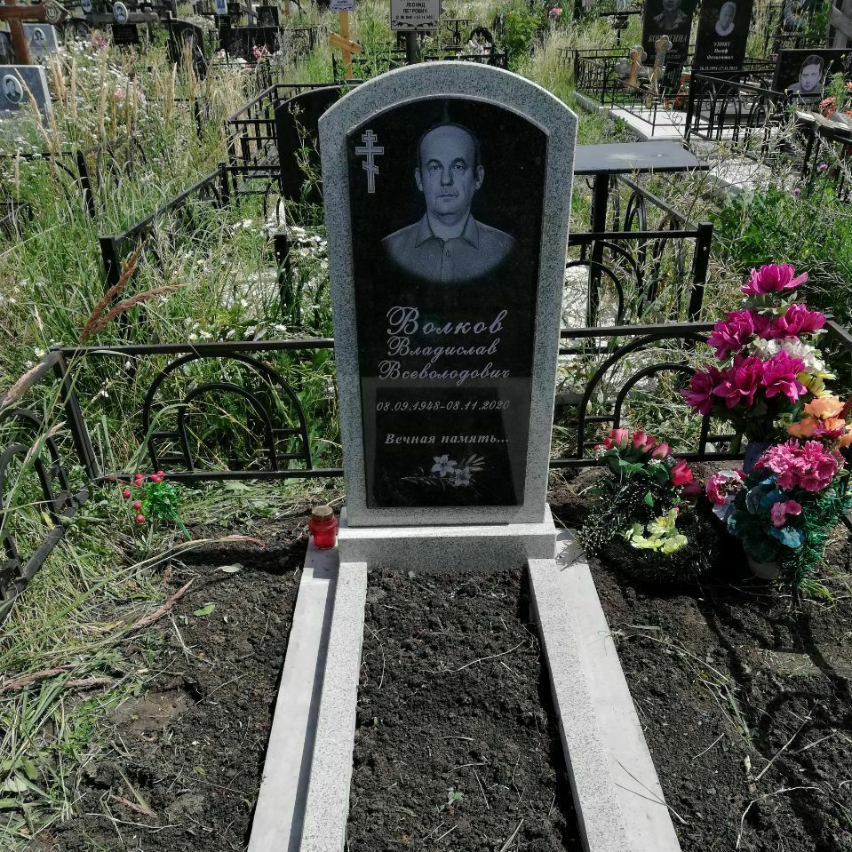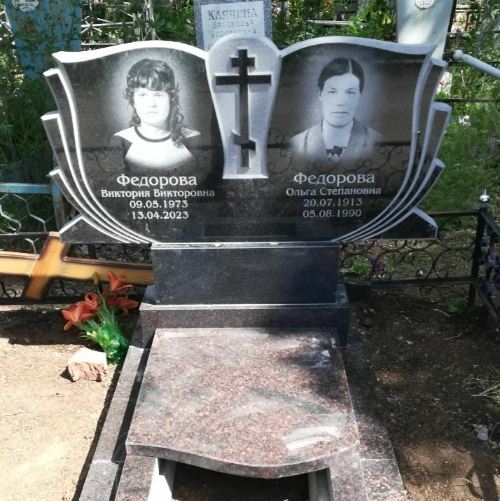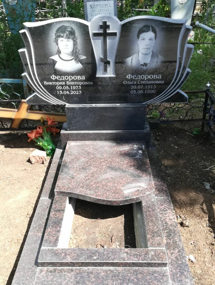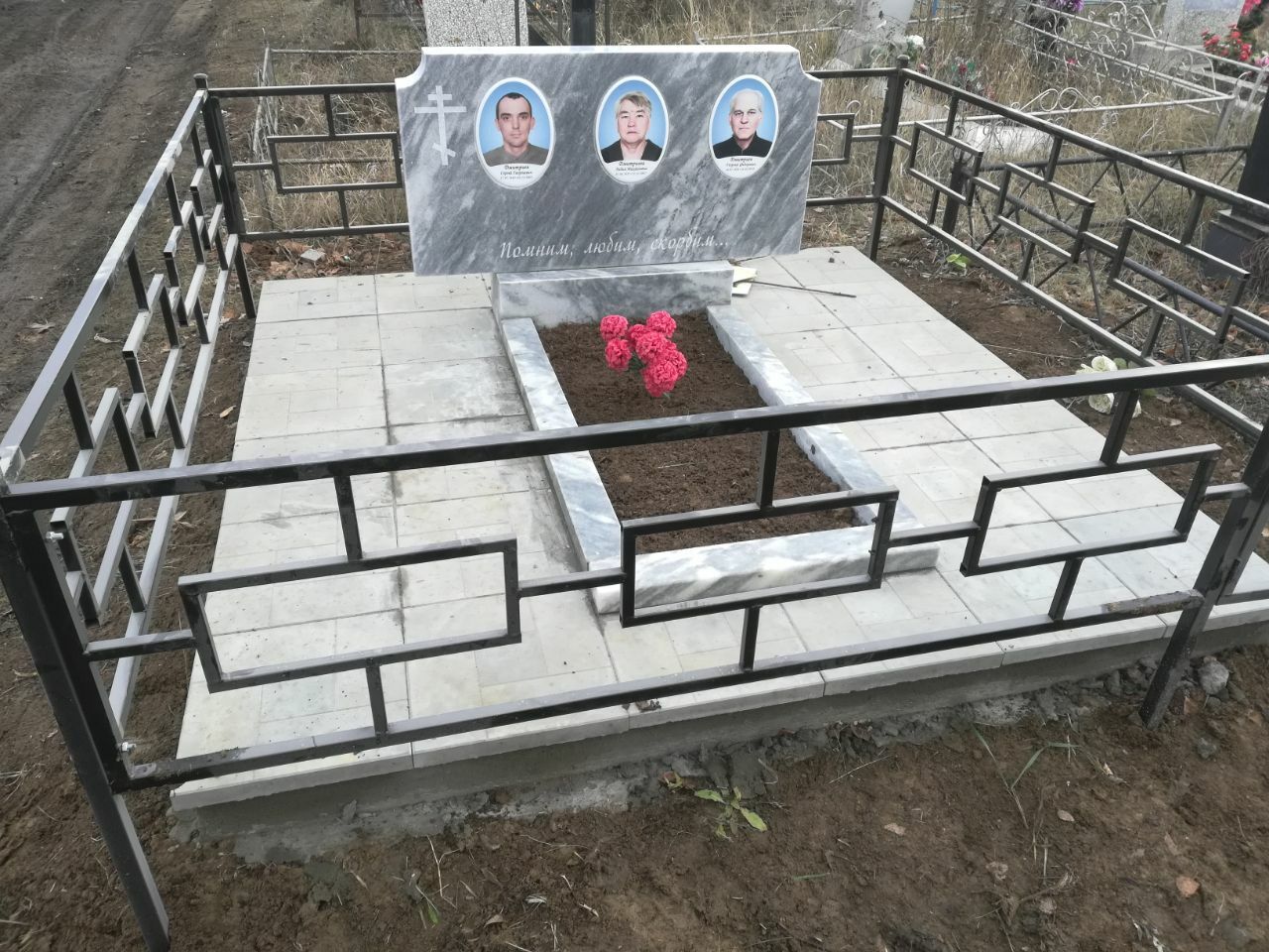 В предложение включены памятник 120-60 см, тумбочка, цветник, фундамент под памятник 200-200, гравировка портретов и надписей. Фундамент облицован бетонной тротуарной плиткой.
