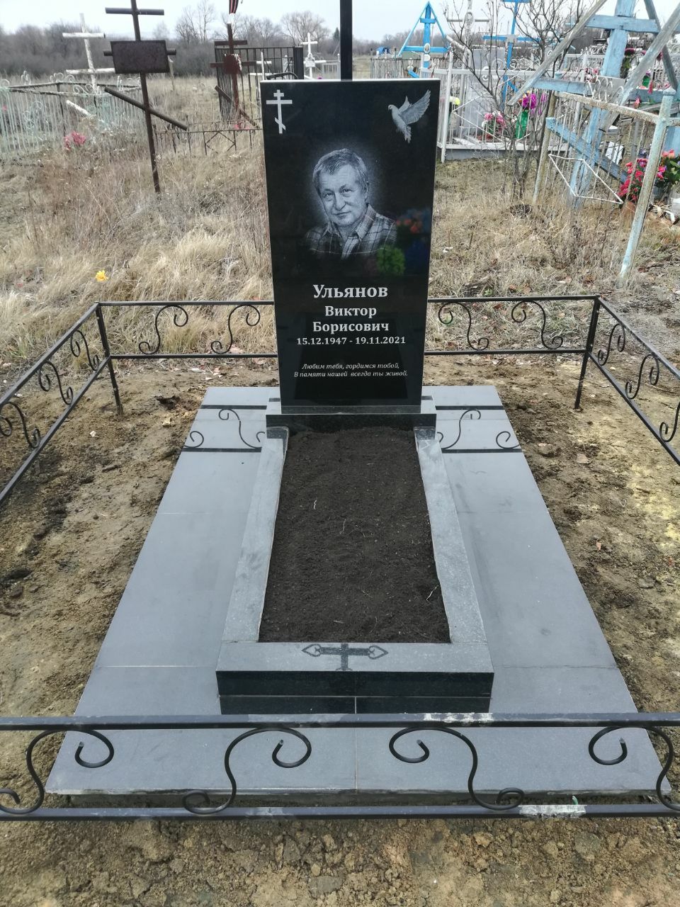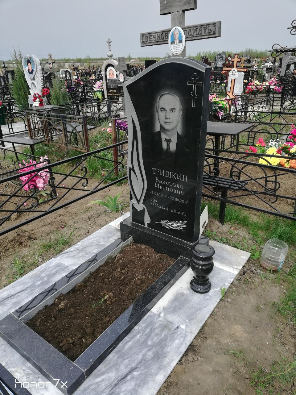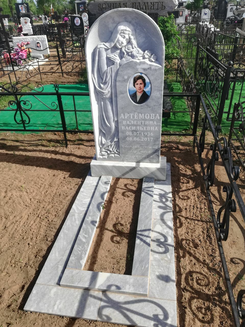 В предложение включены памятник 120-60 см, тумбочка, цветник, фундамент под памятник 200-200, гравировка портретов и надписей. Фундамент облицован бетонной тротуарной плиткой.